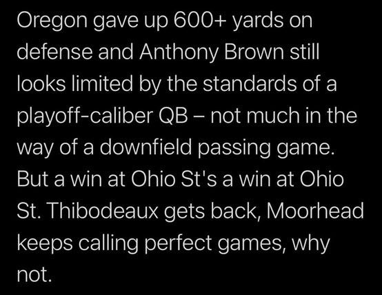 Now, winning a road game over a perennial Playoff contender like Ohio State will inevitably start Playoff discourse around a team like Oregon. And that’s fine!