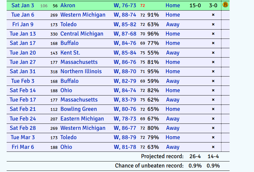 Likewise, as you can see, Miami’s forecasted chance of going 30-0 is a scant 0.9 percent. Earnest discussion as to whether or not the RedHawks can get there when they’re only halfway is premature.